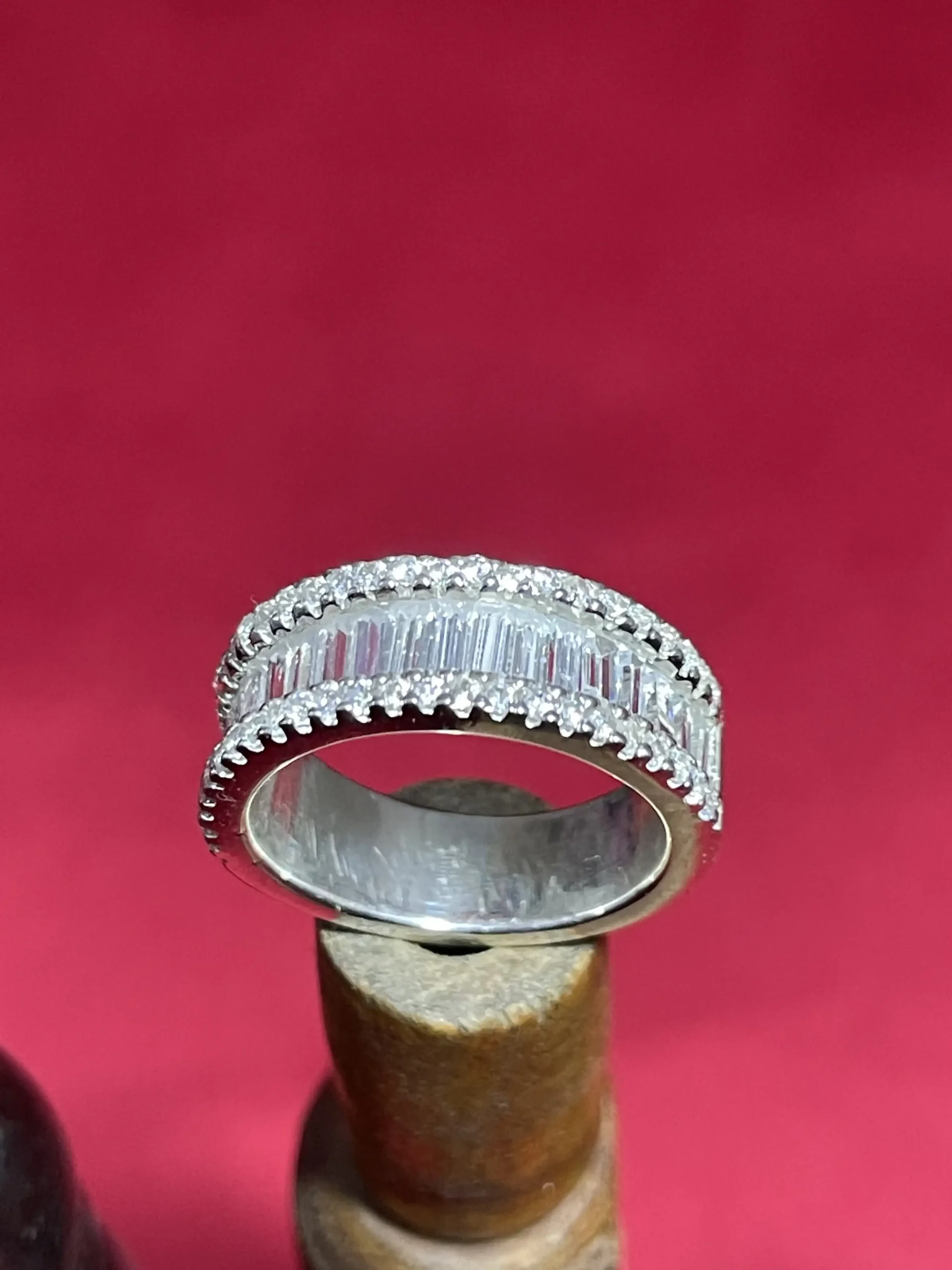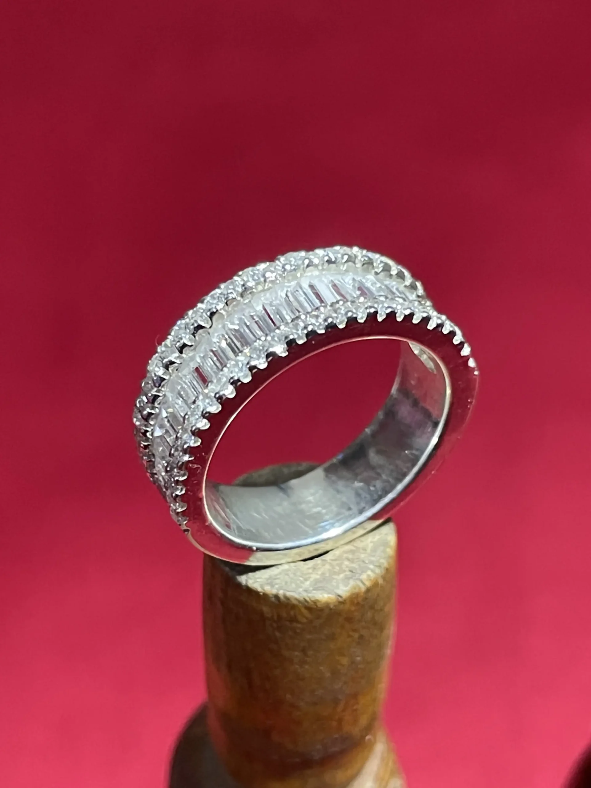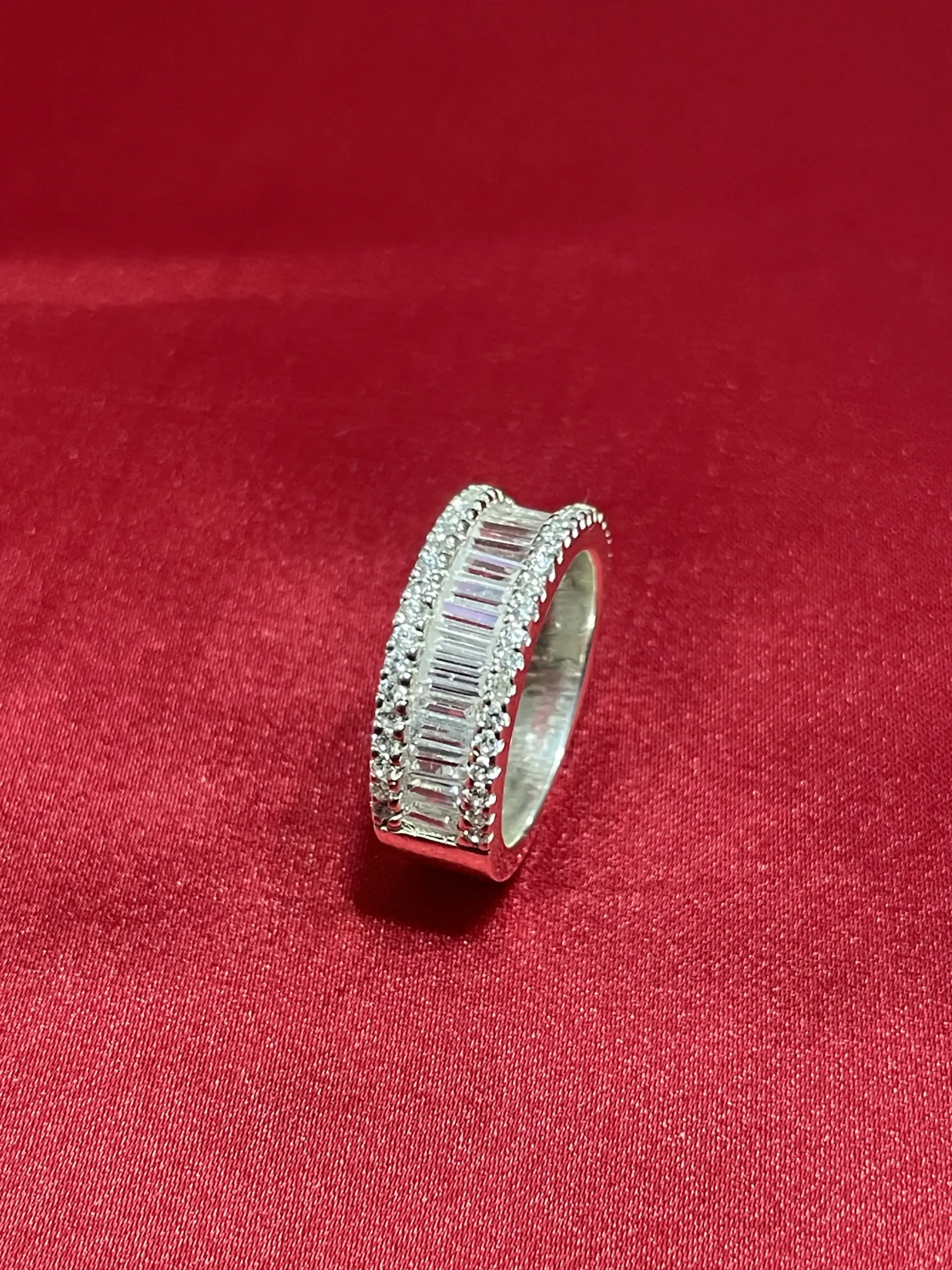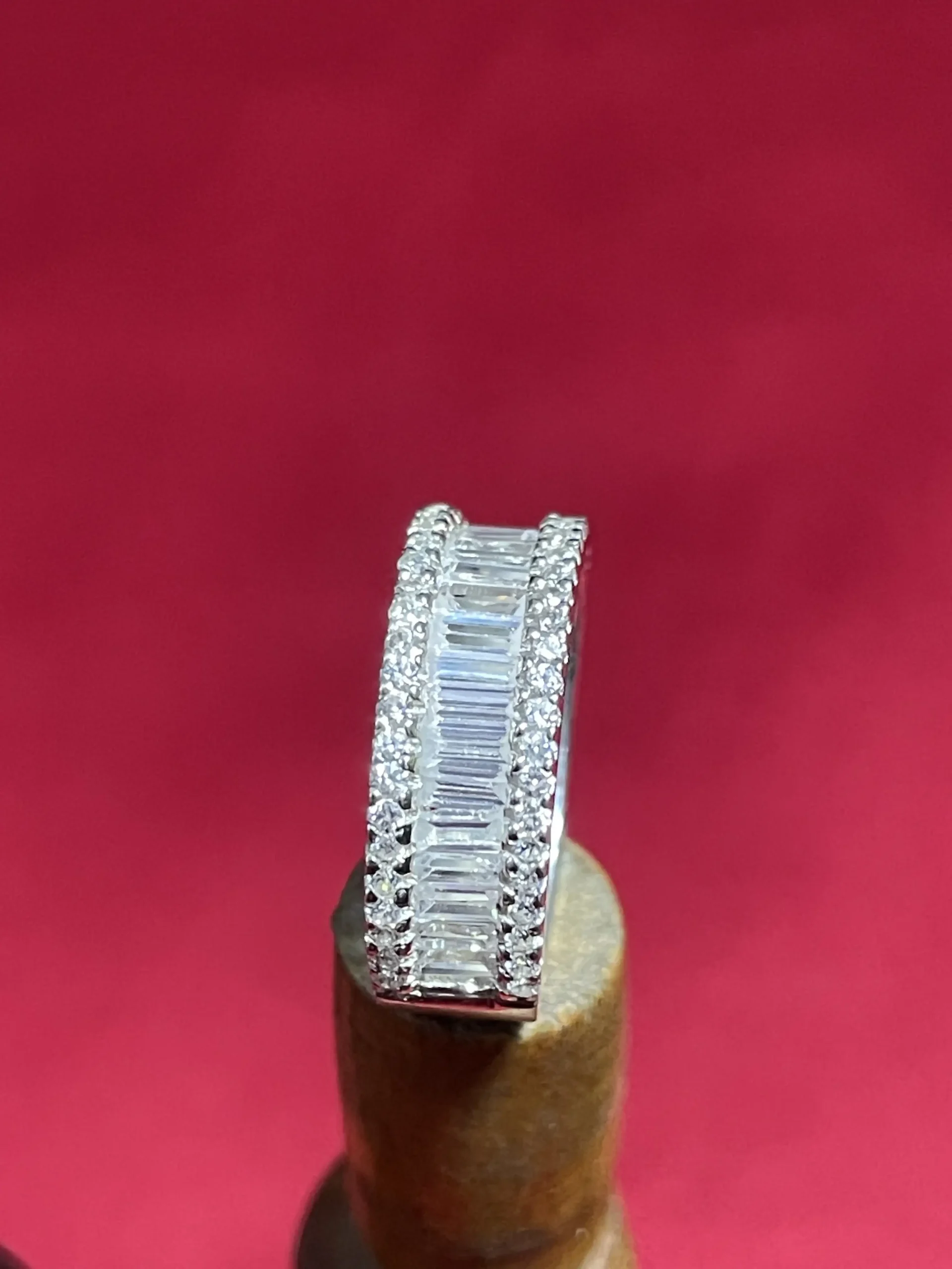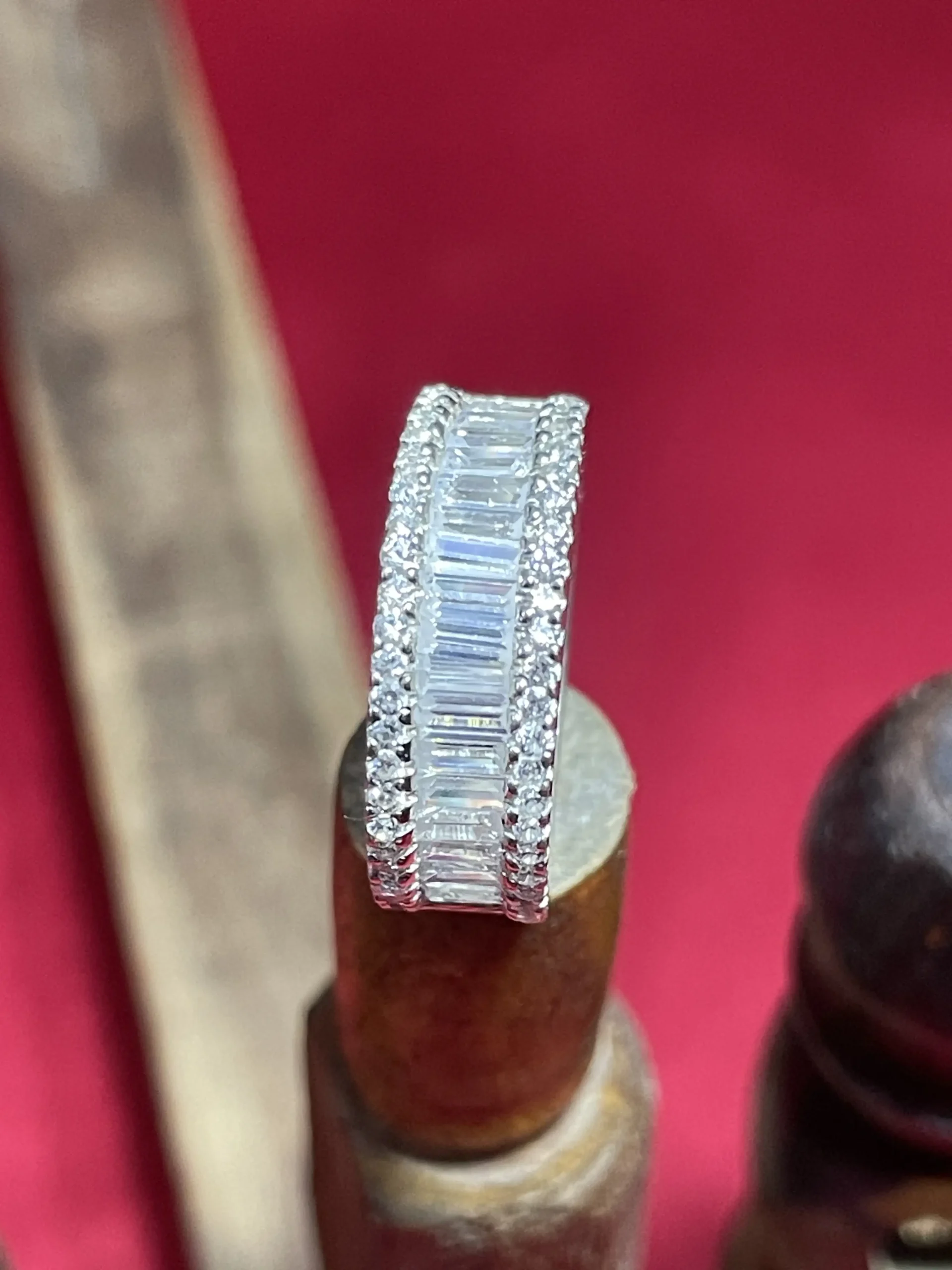 Introducing the Eterna Luxe Band a harmonious blend of sparkle and sophistication, beautifully interpreted in pure, unplated 925 silver. The centerpiece features meticulously arranged baguette-cut stones, embraced on each side by a delicate row of round cut brilliance. Every detail is hand finished, allowing light to dance effortlessly across its surface.